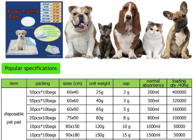 We manufacture disposable pet puppy dog training pads, pet diapers, pet wet wipes, also trade other pet products, including cat litter, cat tower, cat board, pet bed, pet cage, and so on.